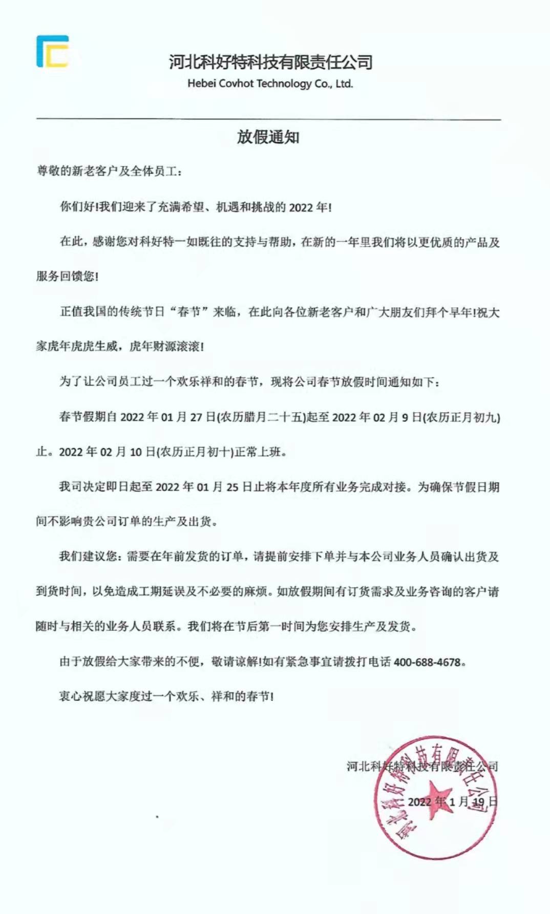 我司決定即日起至2022年01月23日止將本年度所有業務完成對接。為確保節假日期間不影響貴公司訂單的生產及出貨。