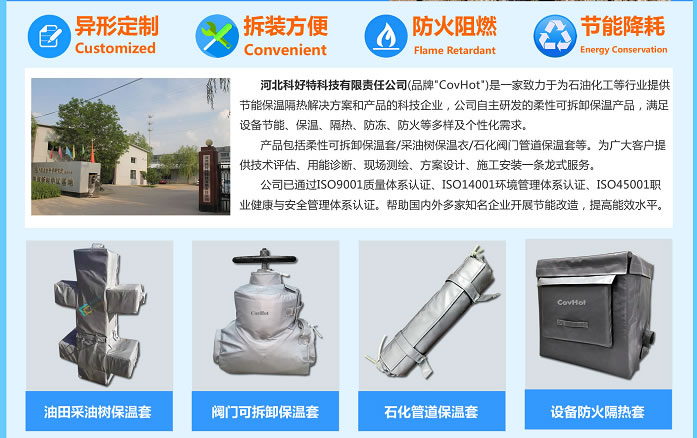 據了解,科好特公司的品牌"CovHot",是一家致力于為石油化工等行業(yè)提供節(jié)能保溫隔熱解決方案和產品的科技企業(yè),科好特自主研發(fā)銷售的柔性可拆卸保溫產品,滿足設備節(jié)能、保溫、隔熱、防凍、防火等多樣及個性化需求。