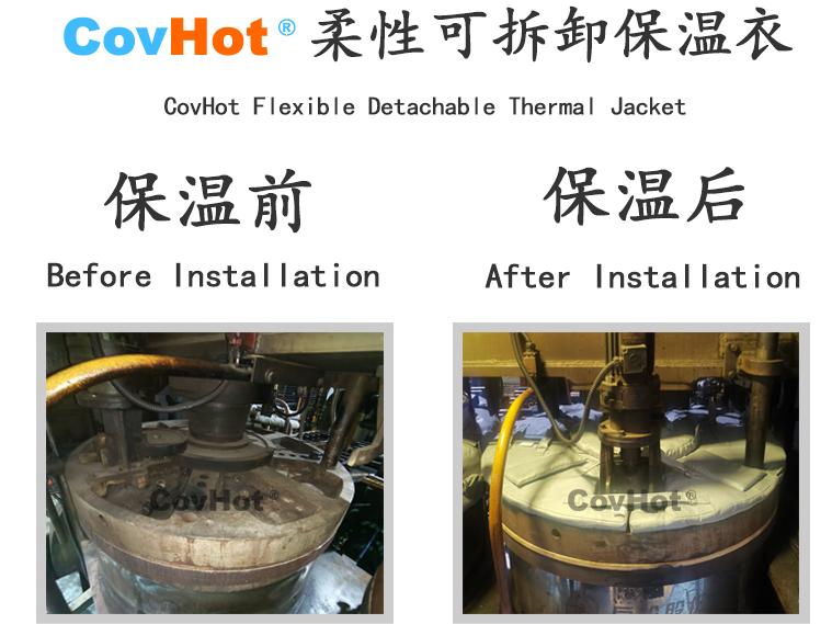 經測試,硫化機保溫隔熱選用硫化機可拆卸保溫套保溫隔熱效果良好,不但可以達到預期的保溫節能的效果,也讓安裝維修也更加方便,更可以有效降低車間溫度,可謂一舉多得。