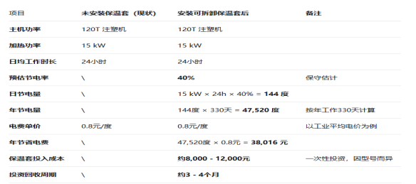 讓我們通過一個(gè)簡單的例子來算一筆賬:某 120T 注塑機(jī),加熱功率 15kW,日均工作 24 小時(shí)。未安裝保溫套時(shí)無節(jié)電效果,安裝可拆卸保溫套后預(yù)估節(jié)電率 40%,日節(jié)電量 144 度,年節(jié)電量 47520 度,年節(jié)省電費(fèi) 38016 元;保溫套投入成本約 8000-12000 元,投資回收周期約 3-4 個(gè)月。
