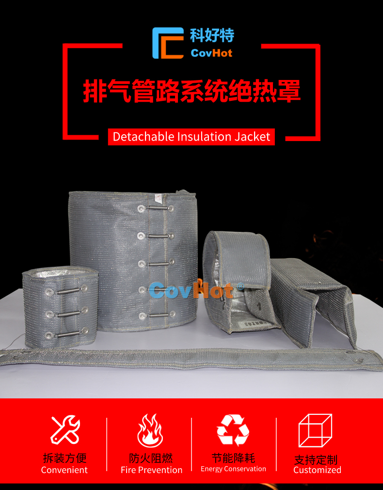 排氣管隔熱套具有易拆裝、可反復循環使用等特點,并且具有柔性,可根據排氣管的形狀,走向設計制作隔熱套,與排氣管貼合度高,包裹性強。能夠有效解決車輛排氣系統保溫隔熱難題。